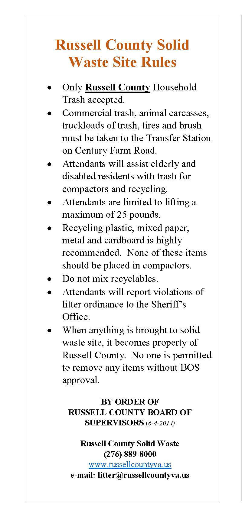 For a full list of rules, please refer to the Russell County Solid Waste Site Rules.