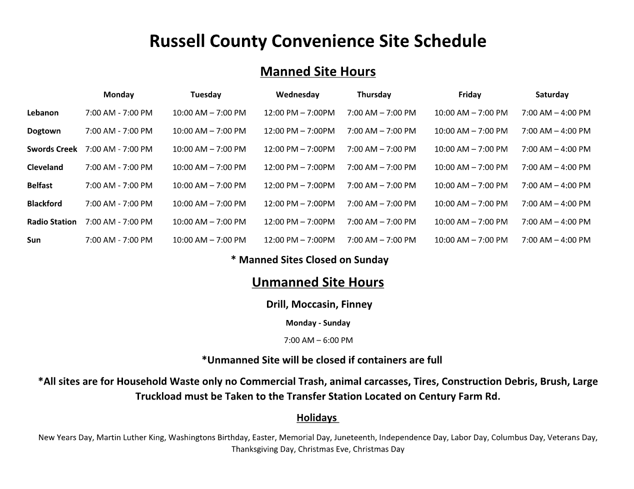 For a full list of rules, please refer to the Russell County Solid Waste Site Rules.
